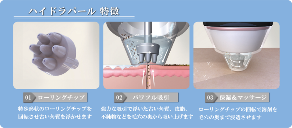 ハイドラパールの第一段階では、特殊な渦巻き状の水流を用いて、毛穴の奥深くまで徹底的にクレンジングを行います。